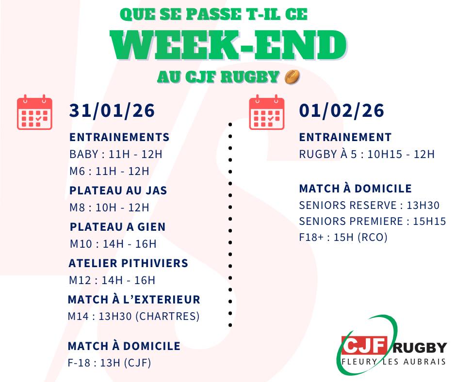 CJF RUGBY Fleury-les-Aubrais Facebook Instagram A LA UNE 🏉 EVENEMENTS DU WEEK END 🏉 ⚫🟢🔴 CLASSEMENT REGIONALE 1 AUTRES CHAMPIONNATS Cliquez ici 🏉CALENDRIERS SAISON 2025 2026