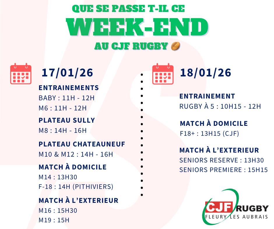 CJF RUGBY Fleury-les-Aubrais Facebook Instagram A LA UNE 🏉 EVENEMENTS DU WEEK END 🏉 CE WEEKEND SEANCE DE RATTRAPAGE ⚫🟢🔴 CLASSEMENT REGIONALE 1 AUTRES CHAMPIONNATS Cliquez ici 🏉CALENDRIERS SAISON 2025 2026