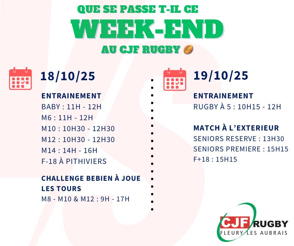 CJF RUGBY Fleury-les-Aubrais Facebook Instagram A LA UNE 🏉 EVENEMENTS DU WEEK END 🏉 ⚫🟢🔴 CLASSEMENT REGIONALE 1 AUTRES CHAMPIONNATS Cliquez ici 🏉CALENDRIERS SAISON 2025 2026