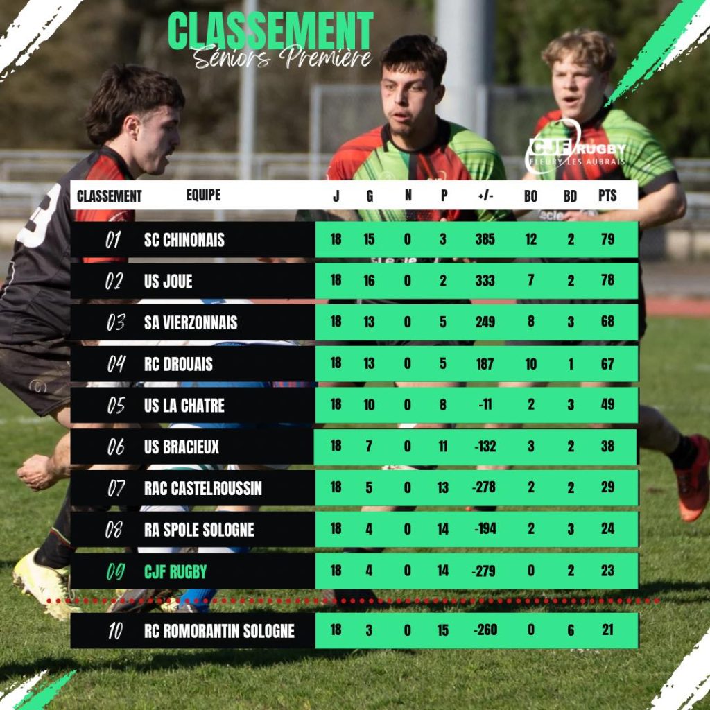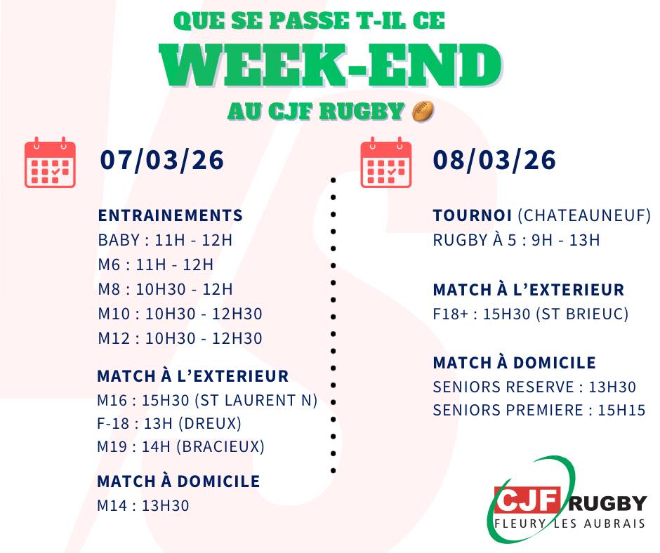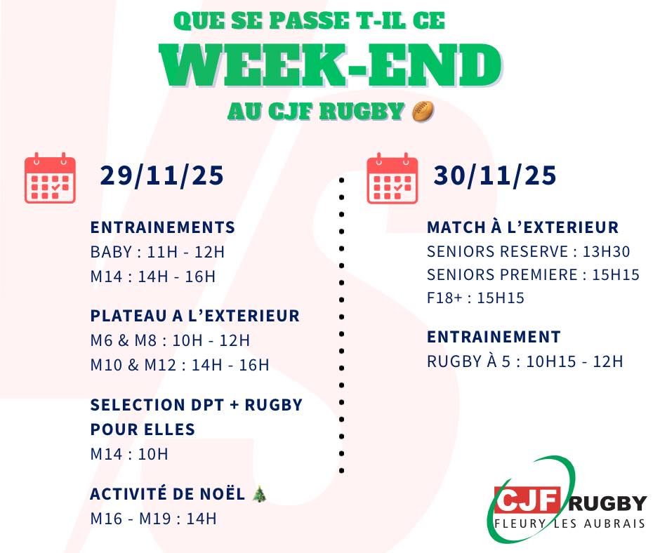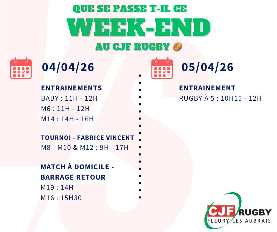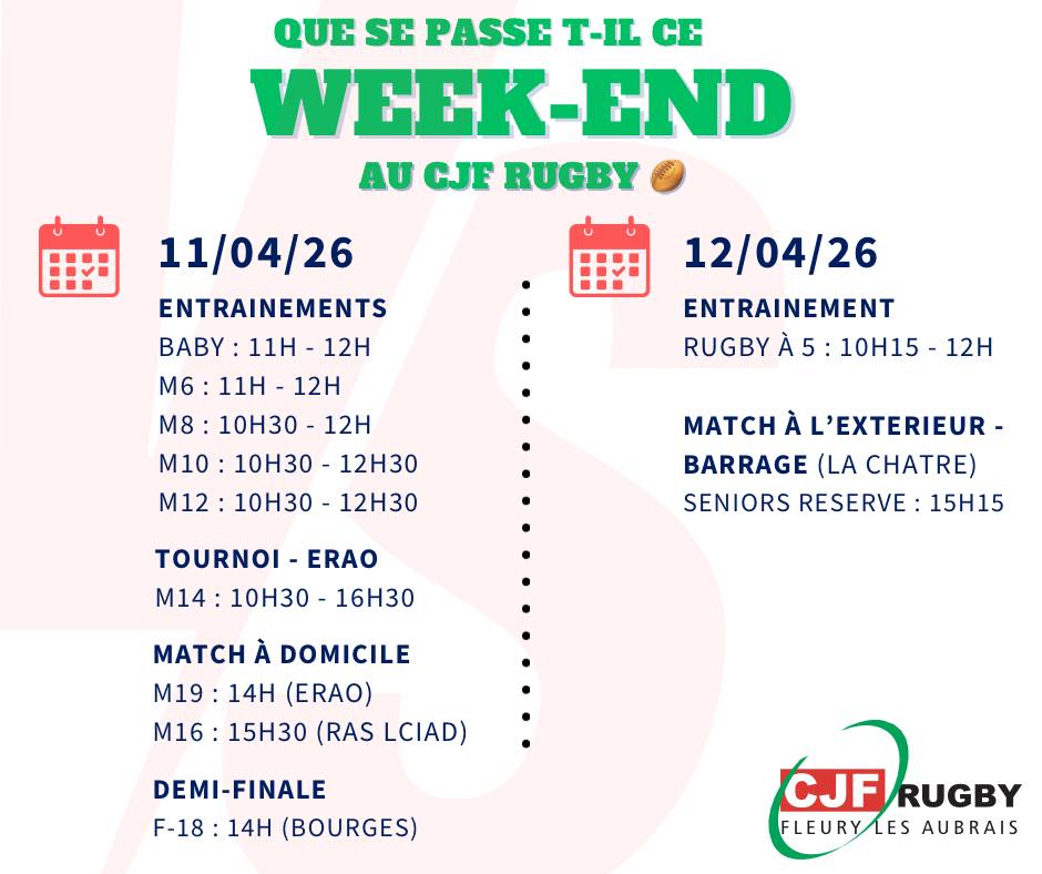 CJF RUGBY Fleury-les-Aubrais Facebook Instagram A LA UNE 🏉 EVENEMENTS DU WEEK END 🏉 ⚫🟢🔴 CLASSEMENT REGIONALE 1 AUTRES CHAMPIONNATS Cliquez ici 🏉CALENDRIERS SAISON 2025 2026