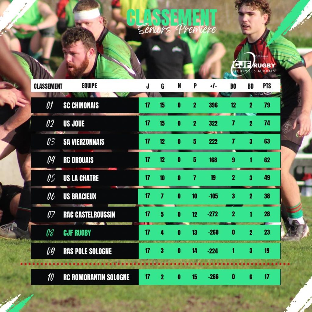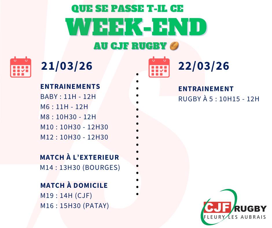 CJF RUGBY Fleury-les-Aubrais Facebook Instagram A LA UNE 🏉 EVENEMENTS DU WEEK END 🏉 CJF FLEURY 2ème ⚫🟢🔴 CLASSEMENT REGIONALE 1 AUTRES CHAMPIONNATS Cliquez ici 🏉CALENDRIERS SAISON 2025 2026